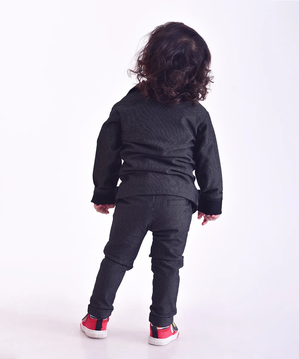 This black Colored boy's wedding outfit comes with trousers, a blazer a white round neck and a half-sleeved t-shirt
