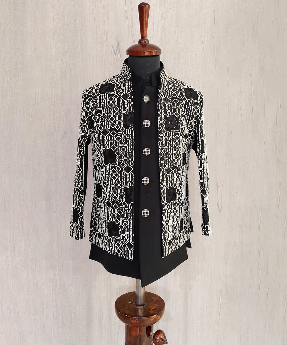 Boys Black Embroidered Blended Sherwani with Pant and Jacket