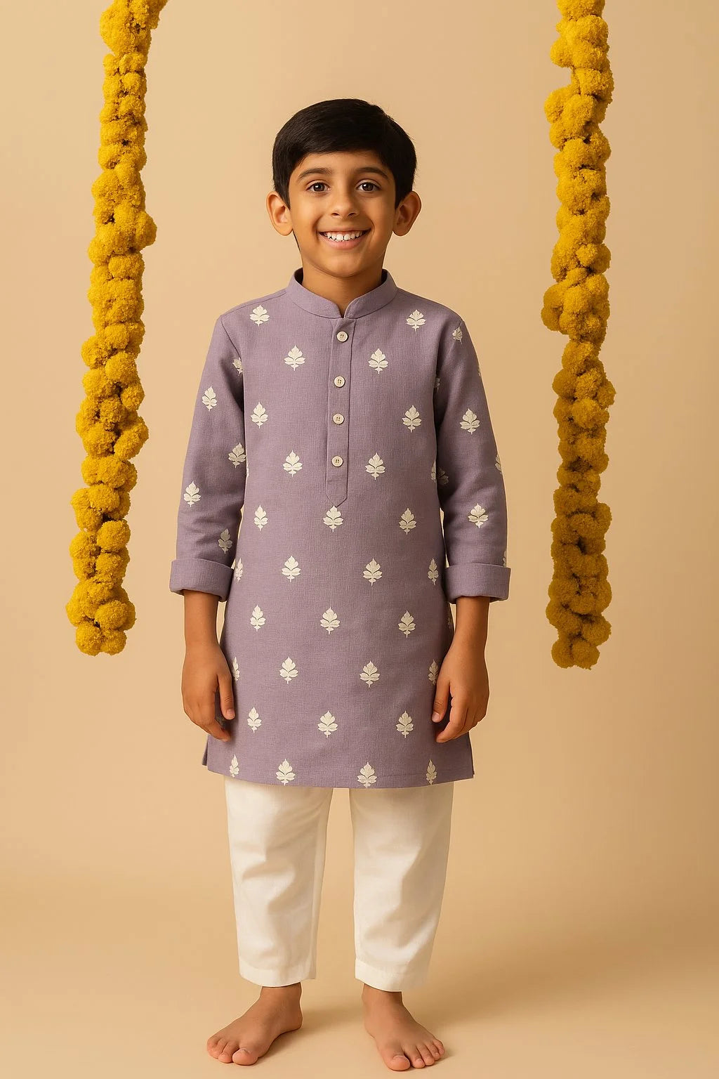 • Elegant designer boys kurta pyjama featuring a soft festive purple base highlighted with delicate all-over floral embroidered kurta, inspired by traditional Rajasthani craftsmanship.