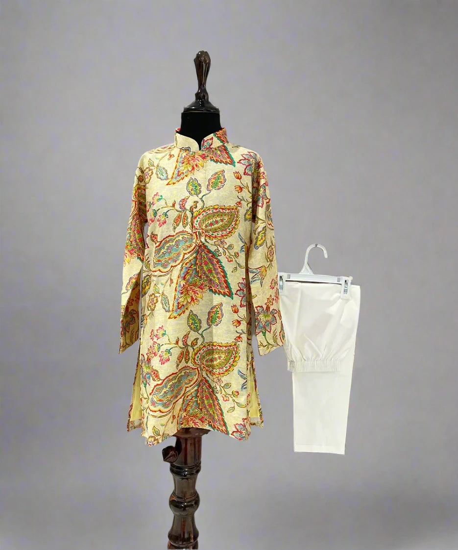 Features a classic neck band collar and full sleeves for a polished, traditional look, making it ideal for those seeking designer kurta pyjama for boys Jaipur and ethnic wear for boys Jaipur..