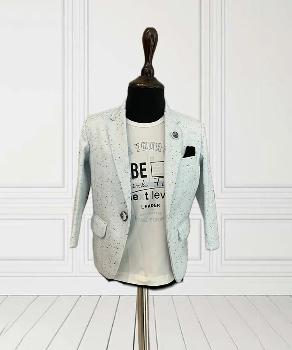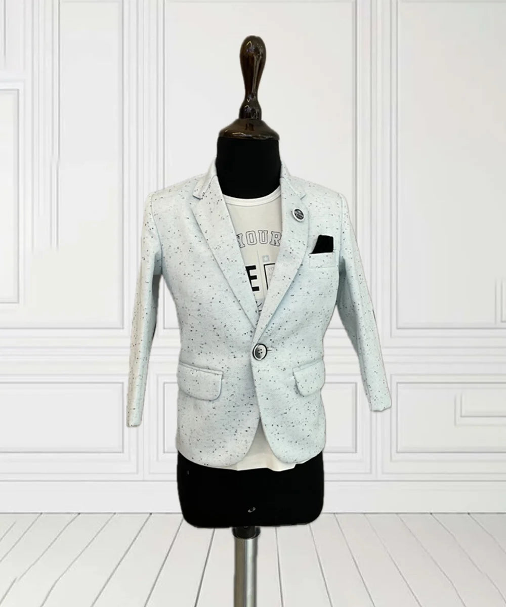 This boys birthday outfit consists of a self-printed light blue coloured Blazer and a matching self-printed white Colored t-shirt. It features a cute broach and a black coloured pocket square.