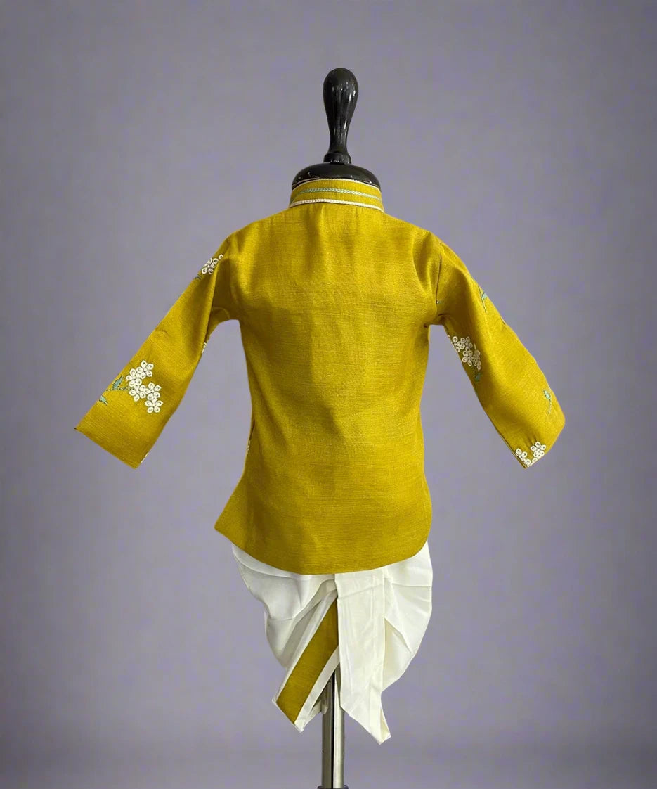 Adorable mustard yellow kurta set for infant and toddler boys—crafted in pure cotton, designed exclusively for ages 0-3 months to 2-3 years at the best kids clothing store in Jaipur.