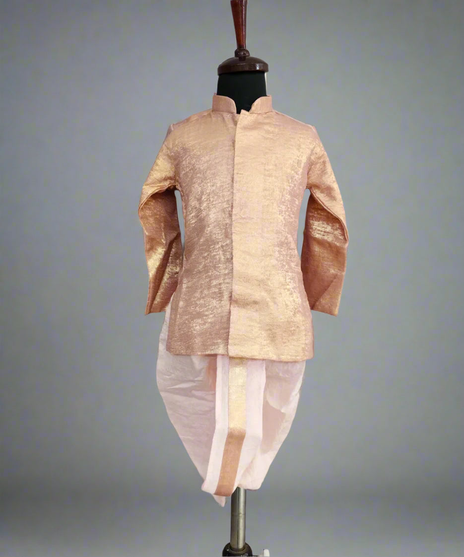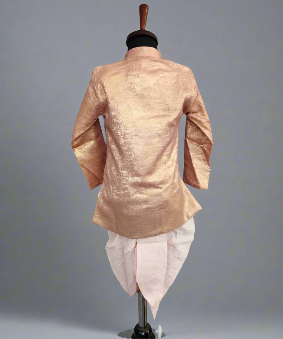 Adorable peach shimmer cotton dhoti kurta set for infant and toddler boys, crafted for ages 0-3 months to 2-3 years—available at the best kids clothing store in Jaipur and top-rated kidswear shop in Jaipur.
