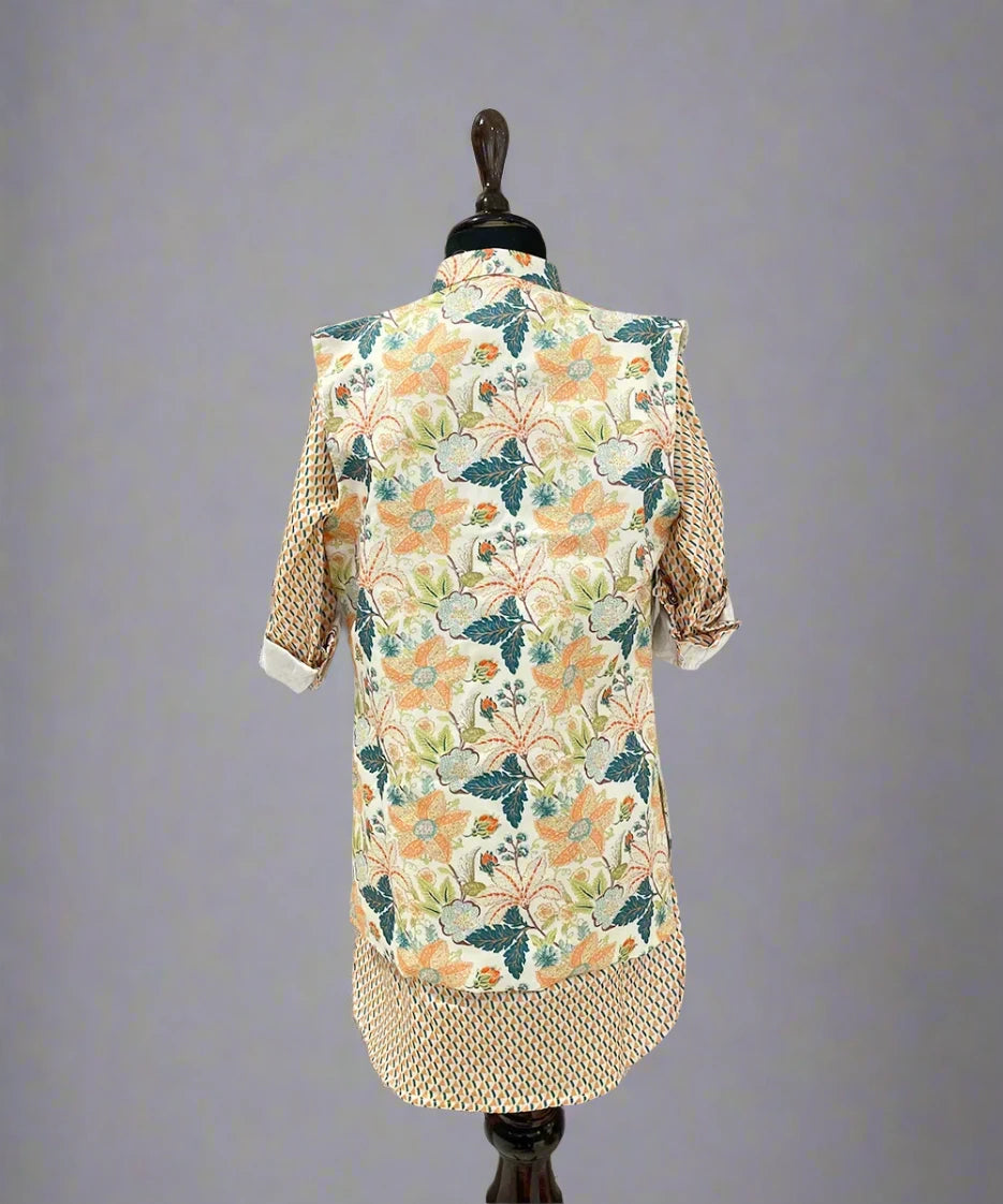 The long, vibrantly printed waistcoat adds a touch of designer flair and elevates the entire ensemble—perfect for family occasions and photo moments