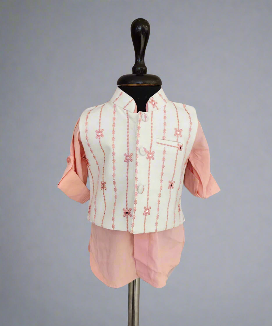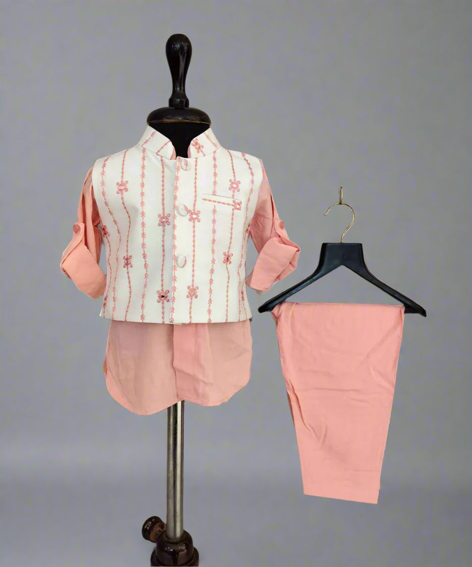 Features a contrasting cream color jacket with intricate hand-worked peach detailing—giving this Jaipur boys kurta pyjama set a unique, premium look
