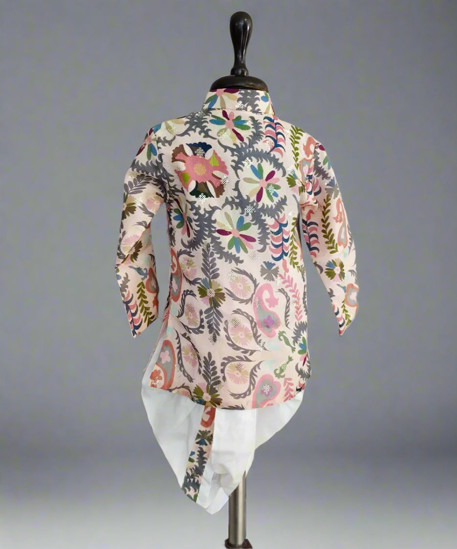 The rich multicolor motifs make it a standout in ethnic wear for boys Jaipur, suited for occasions from Rakhi to wedding gatherings