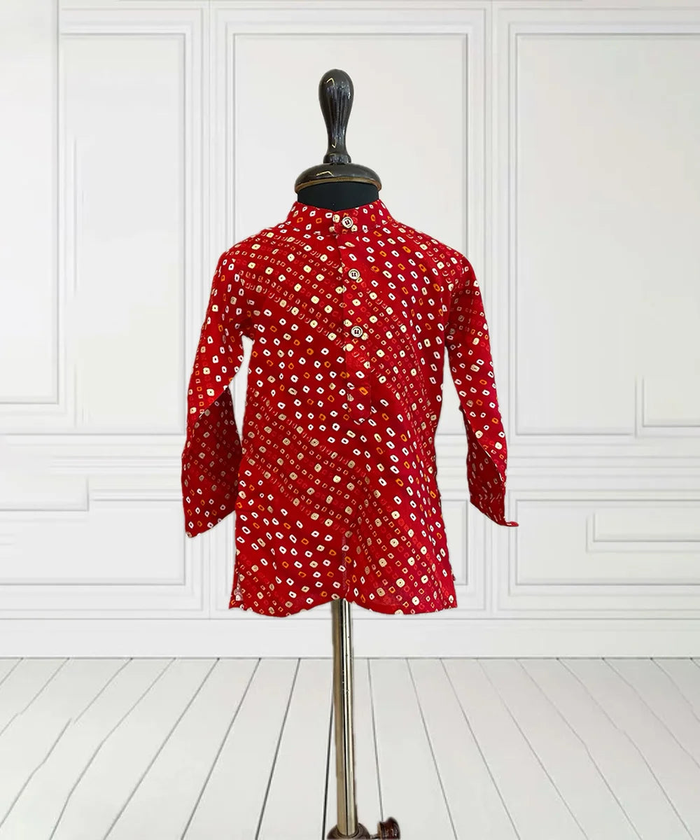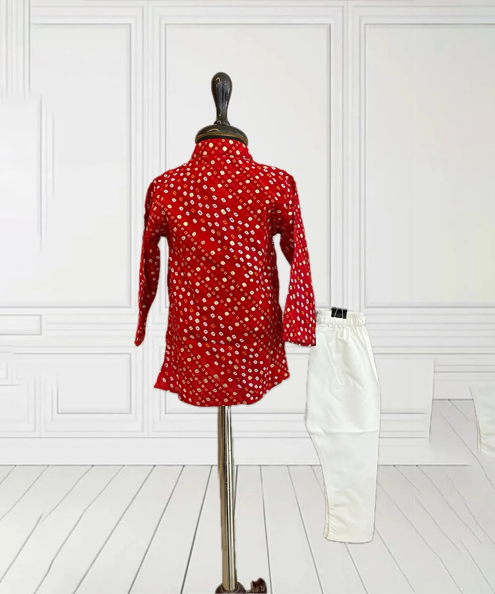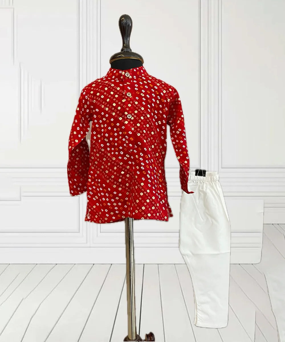 Eye-catching bhandej print boys kurta pyjama set in radiant red and white, crafted for ages 1–14, especially tailored for party occasions and festive events in Jaipur