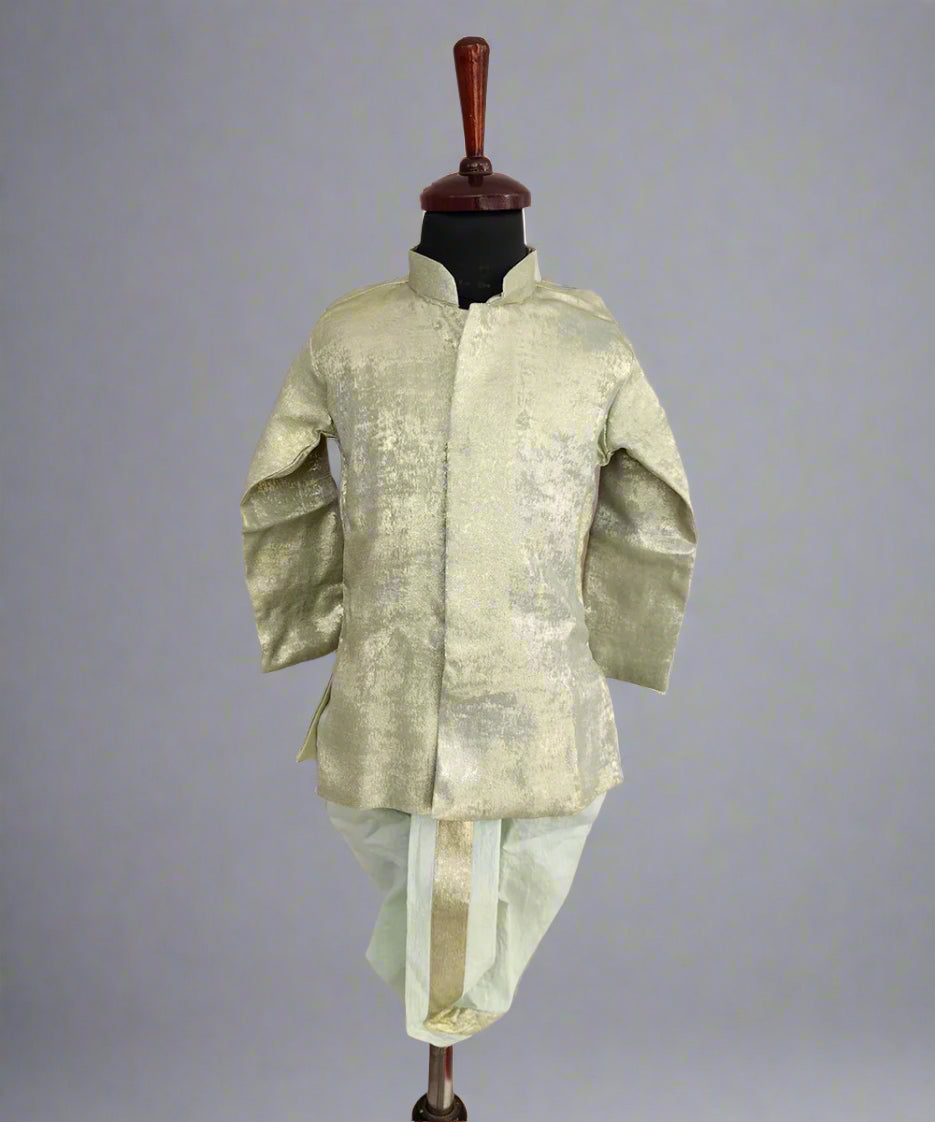 Charming green shimmer cotton dhoti kurta set for infant and toddler boys, crafted for ages 0-3 months to 2-3 years—available at the best kids clothing store in Jaipur and top-rated kidswear shop in Jaipur.
