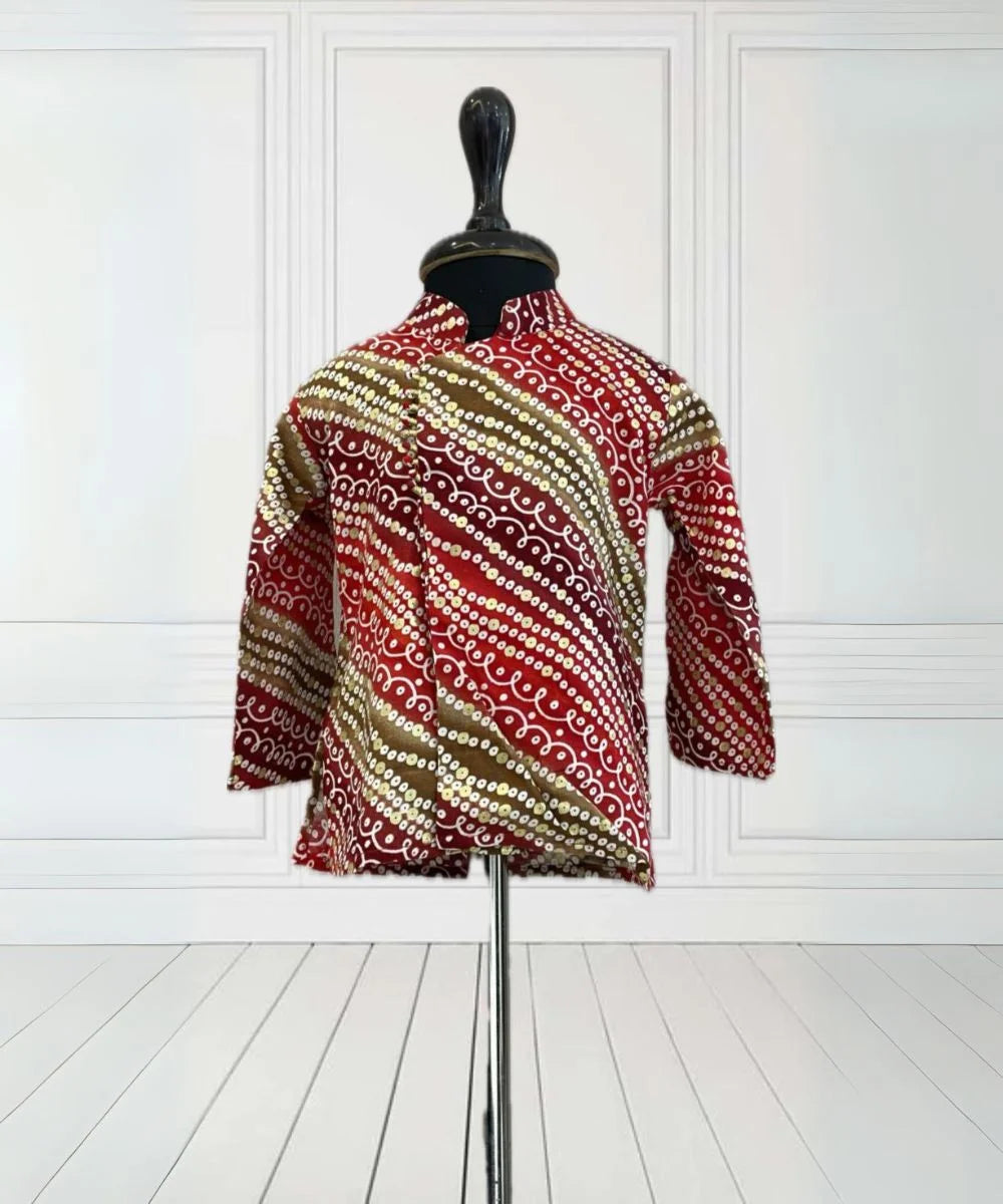 Vibrant bhandej print boys kurta set with a full-sleeve, self-printed cotton kurta in maroon and white tones, designed for infants (9-12 months)—the ideal choice for parties, Rakhi, or festive ceremonies in Jaipur
