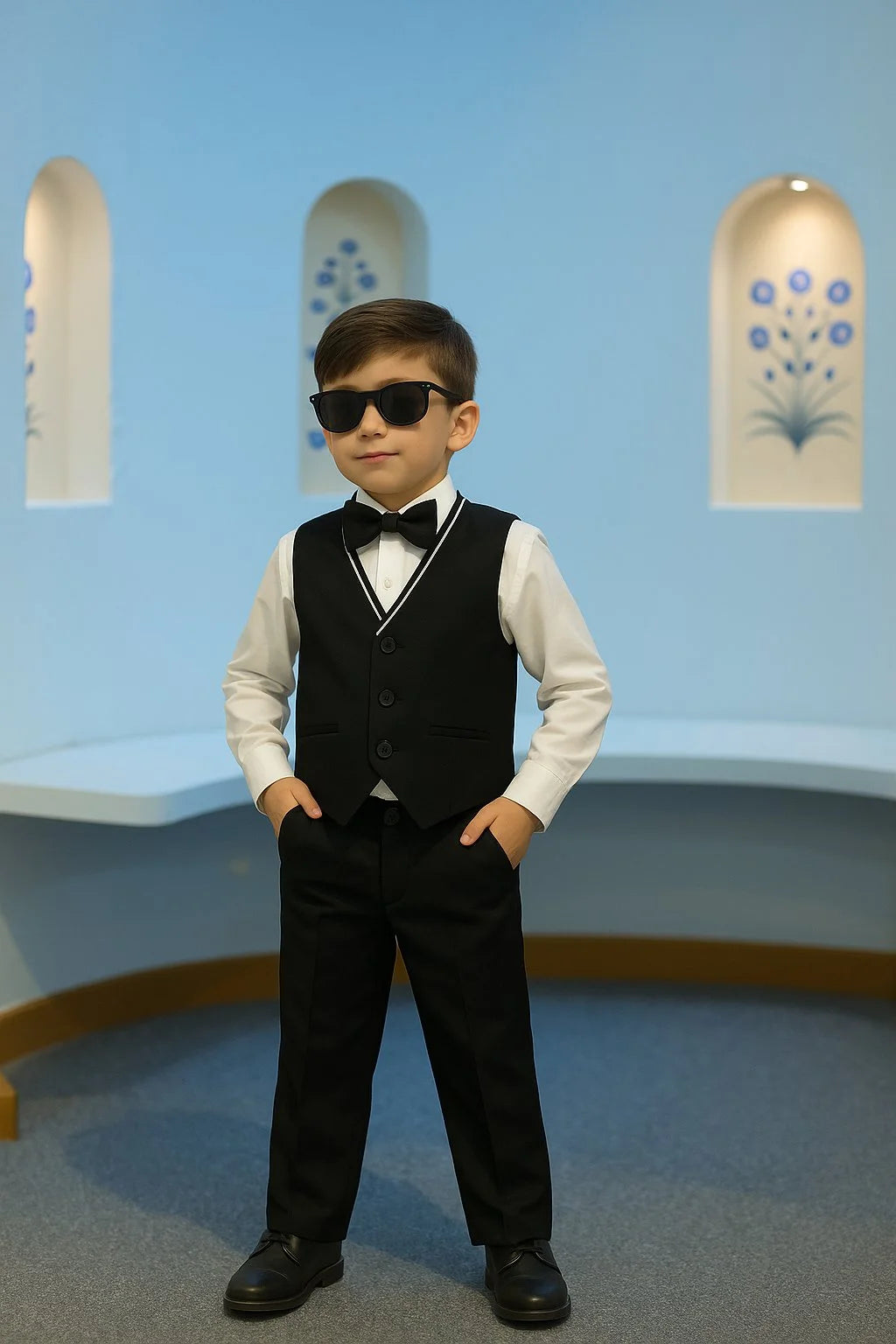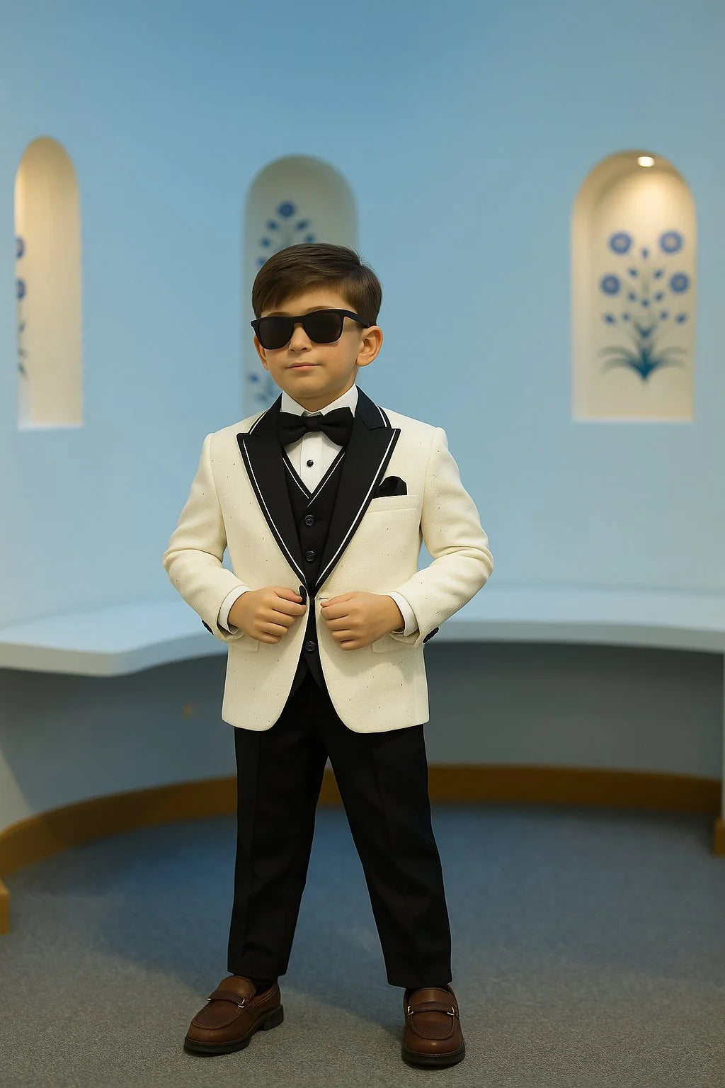 Styled with a matching bow, sleek broach, and contrast pocket square that instantly elevates this boys tuxedo into a premium celebration ensemble.