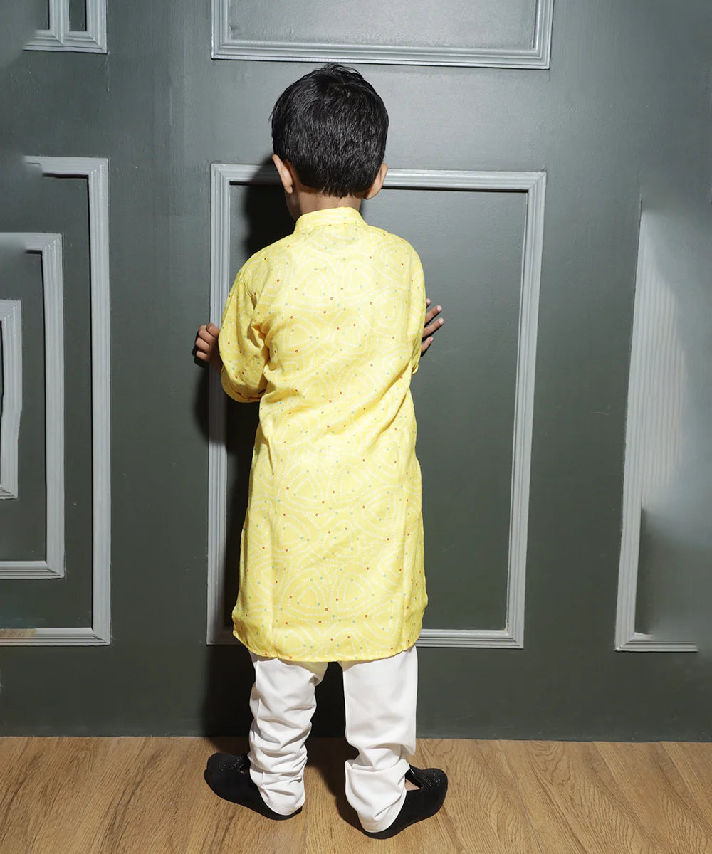Smart yellow printed boys kurta pyjama set crafted for ages 1–14 years—ideal for festive gatherings, poojas, and small celebrations in Jaipur.