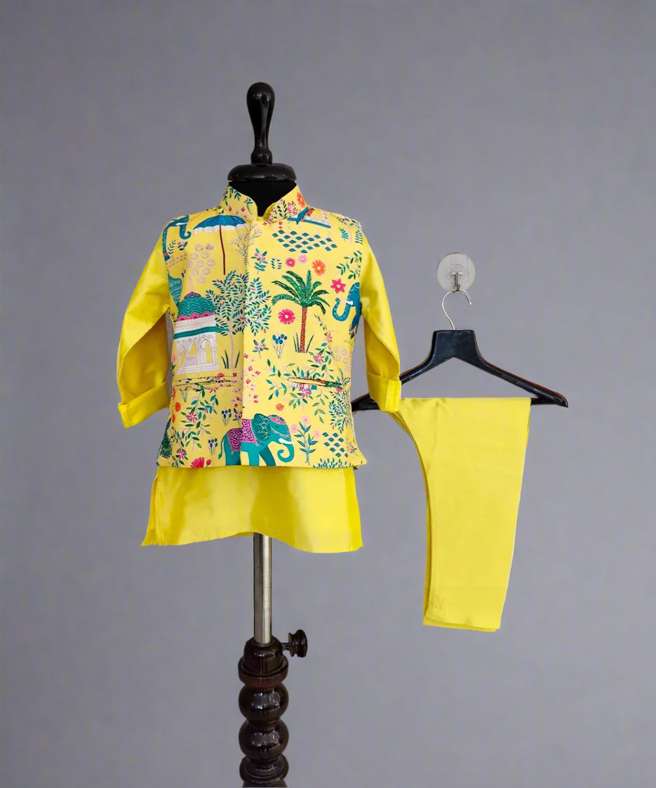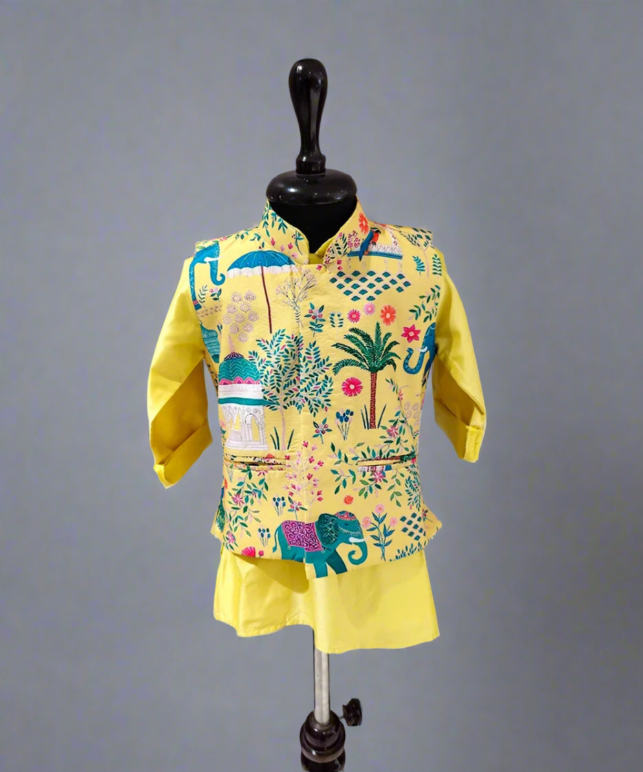 Jacket-inspired design gives a modern look to this traditional kurta pyjama for boys Jaipur, making it suitable for weddings, festivals, and special celebrations