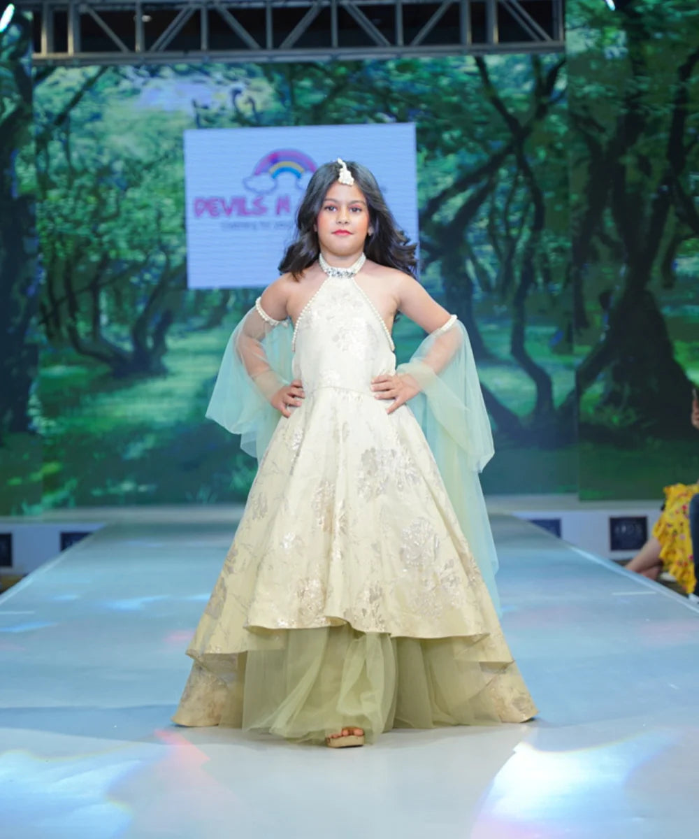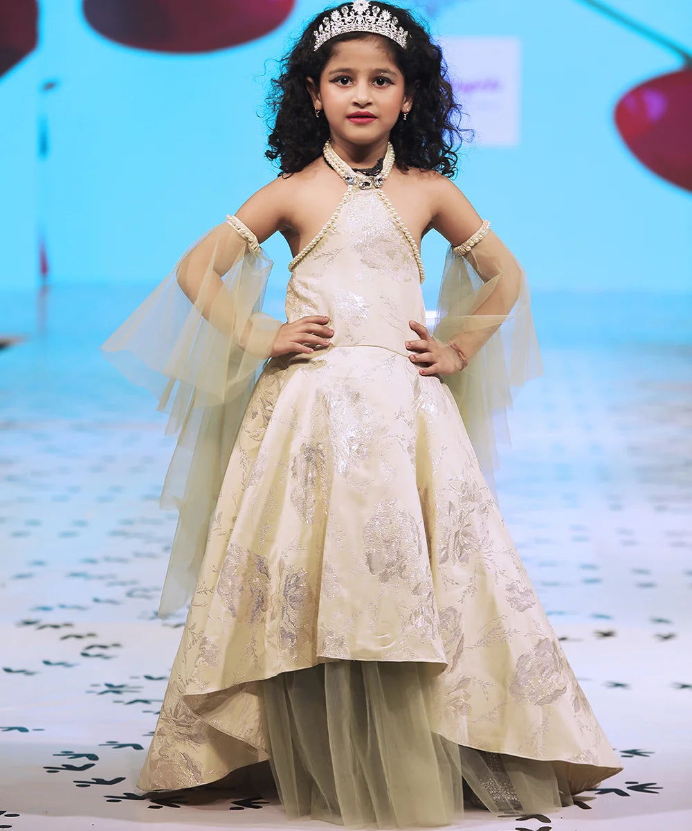 • Description: It’s a backless, stylish gown for girls that is paired with detachable sleeves and comes with a back zip closure.