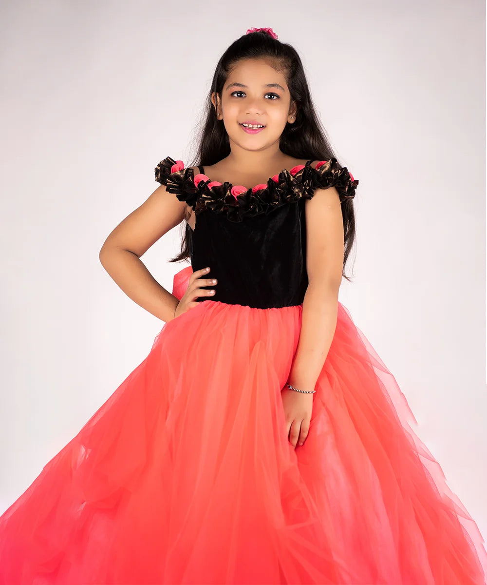 It’s a peach and black Colored gown for girl that comes with the back zip closure. It features floral as well as ruffle detailing on the dress and comes with the fabric belt to be tied at the back.