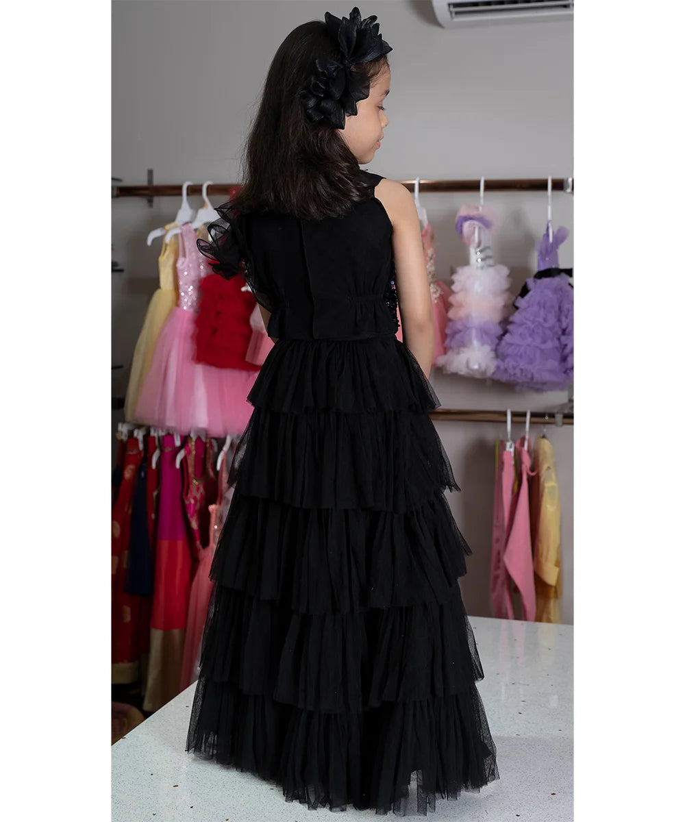 Black sequin one-shoulder lehenga for kids, layered ruffle skirt, perfect for weddings in Jaipur