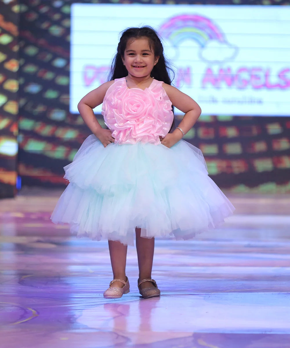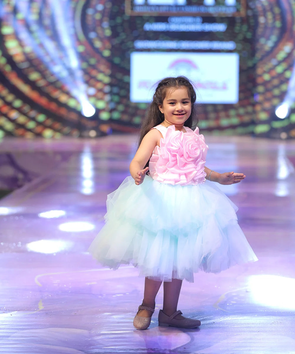 Stunning designer birthday frock for girls in pastel pink and white, featuring a dramatic floral bodice and a fluffy tutu skirt—perfect for ages 2–14 years