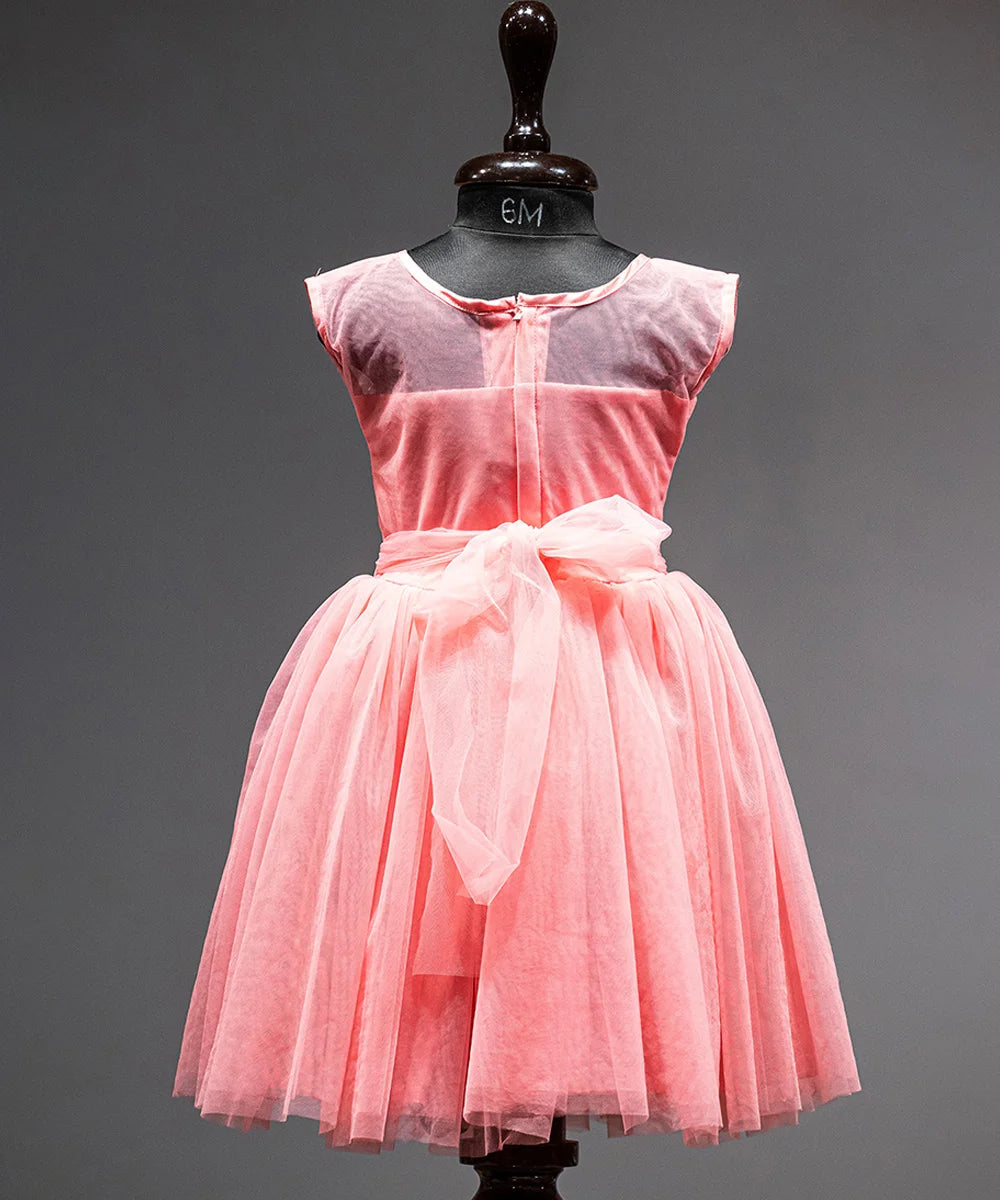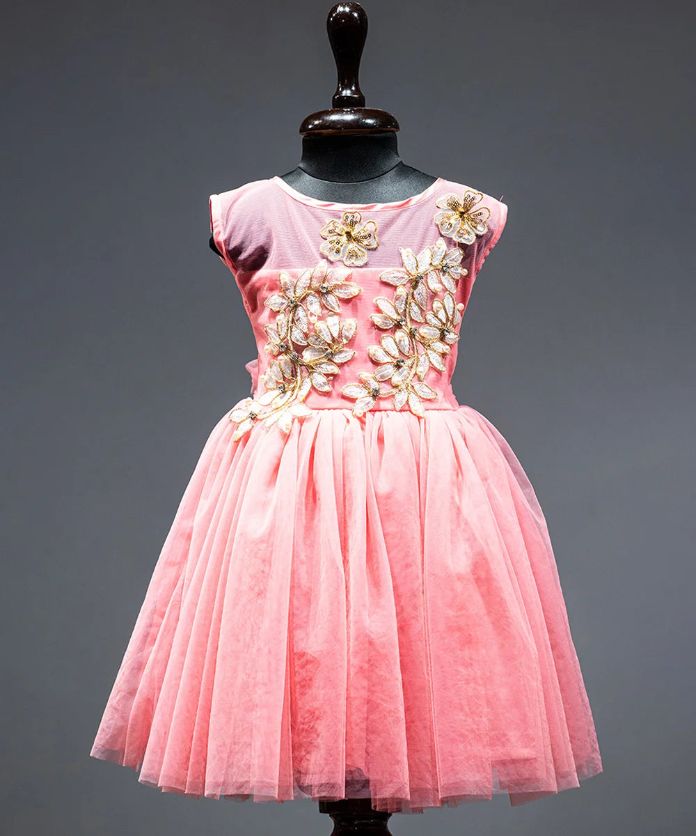Peach Colored frock that comes with a zip closure at the back and with floral applique work in front.