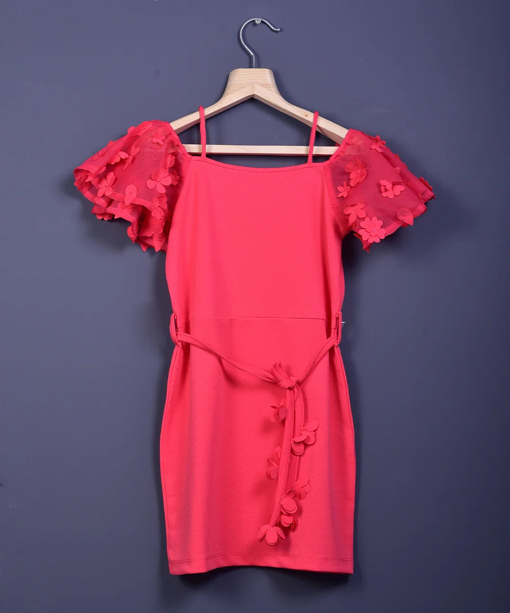 It is a pink dress for the birthday that comes with a matching belt. It featured cute floral detailing on sleeves and a belt to add grace to the outfit.