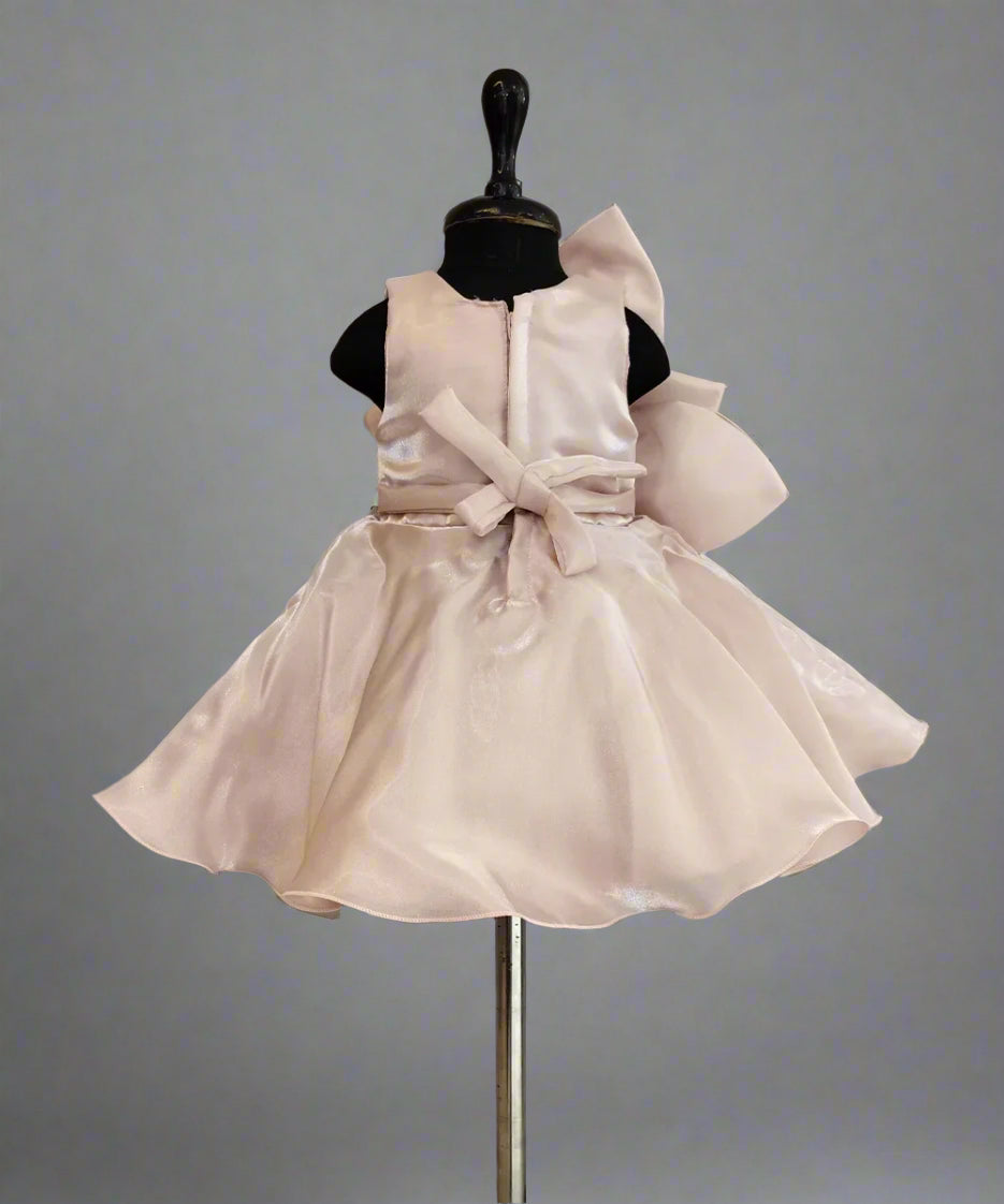 Elegant peach-colored baby birthday frock featuring a large floral bow on the chest, perfect for birthday celebrations and special occasions.