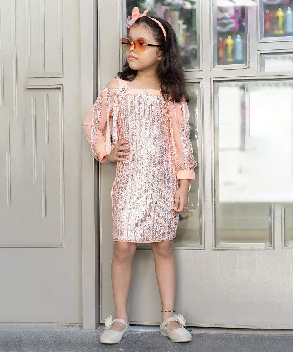 Peach Color Sequin Party Wear Dress for Girls