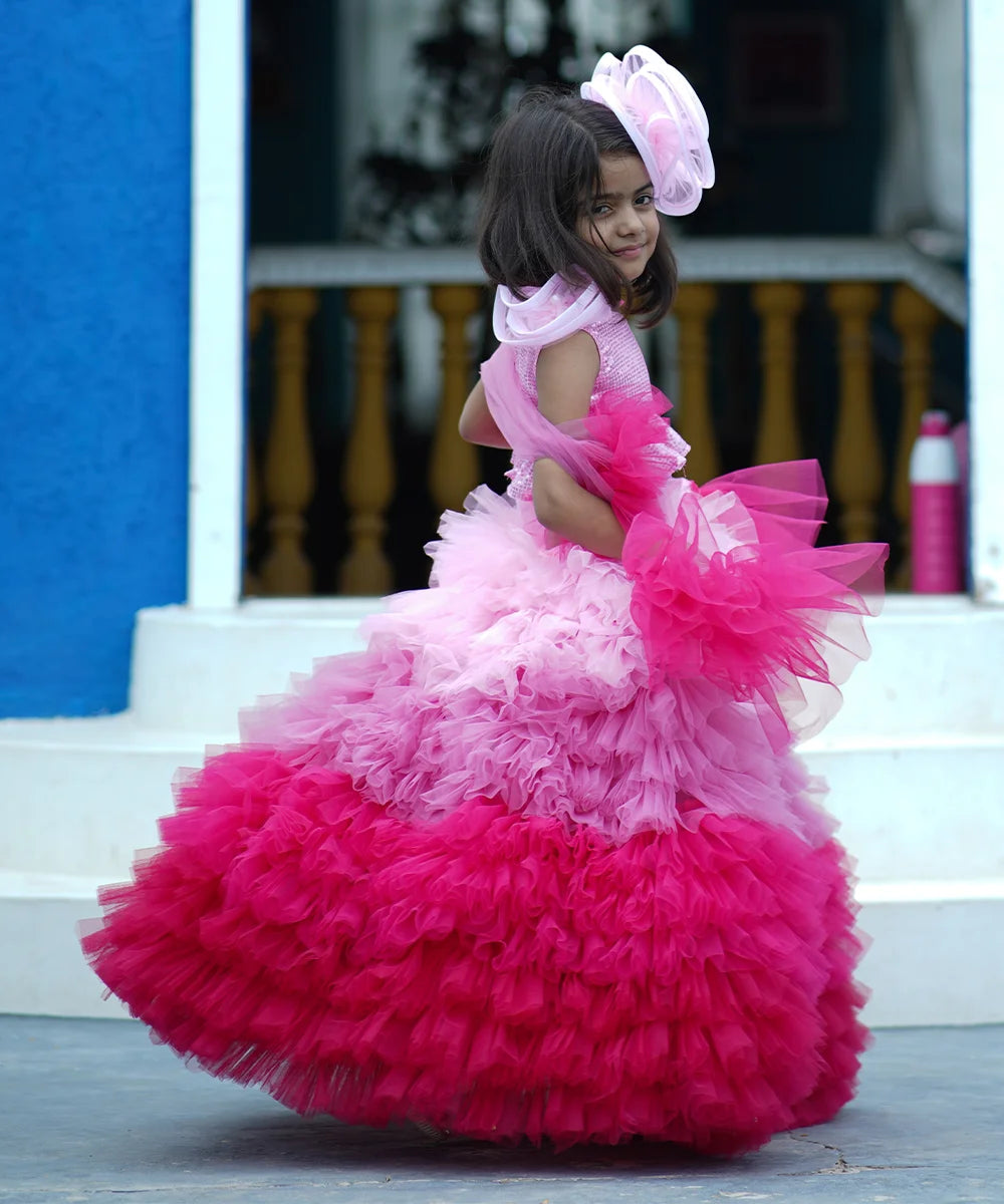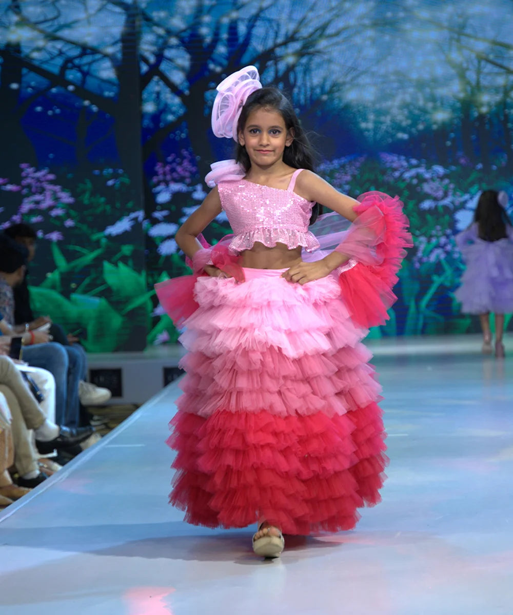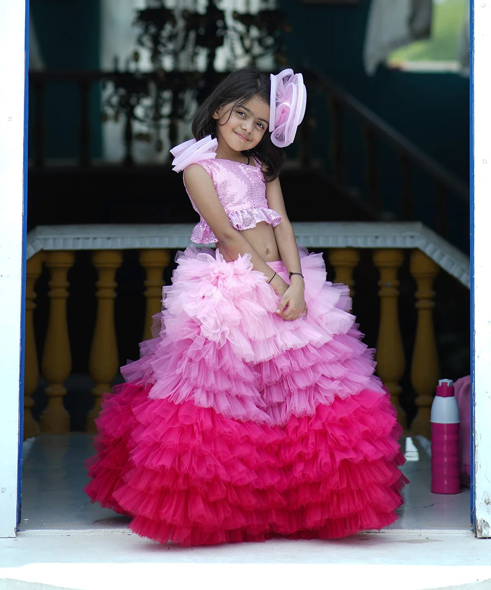 Gorgeous ombre-shaded lehenga set for girls (2–14 years), featuring a dramatic layered ruffled skirt, ruffled choli with back hook closure, pleated dupatta with pearl and sequin lace, and a matching hair accessory—perfect for weddings and festive parties in Jaipur