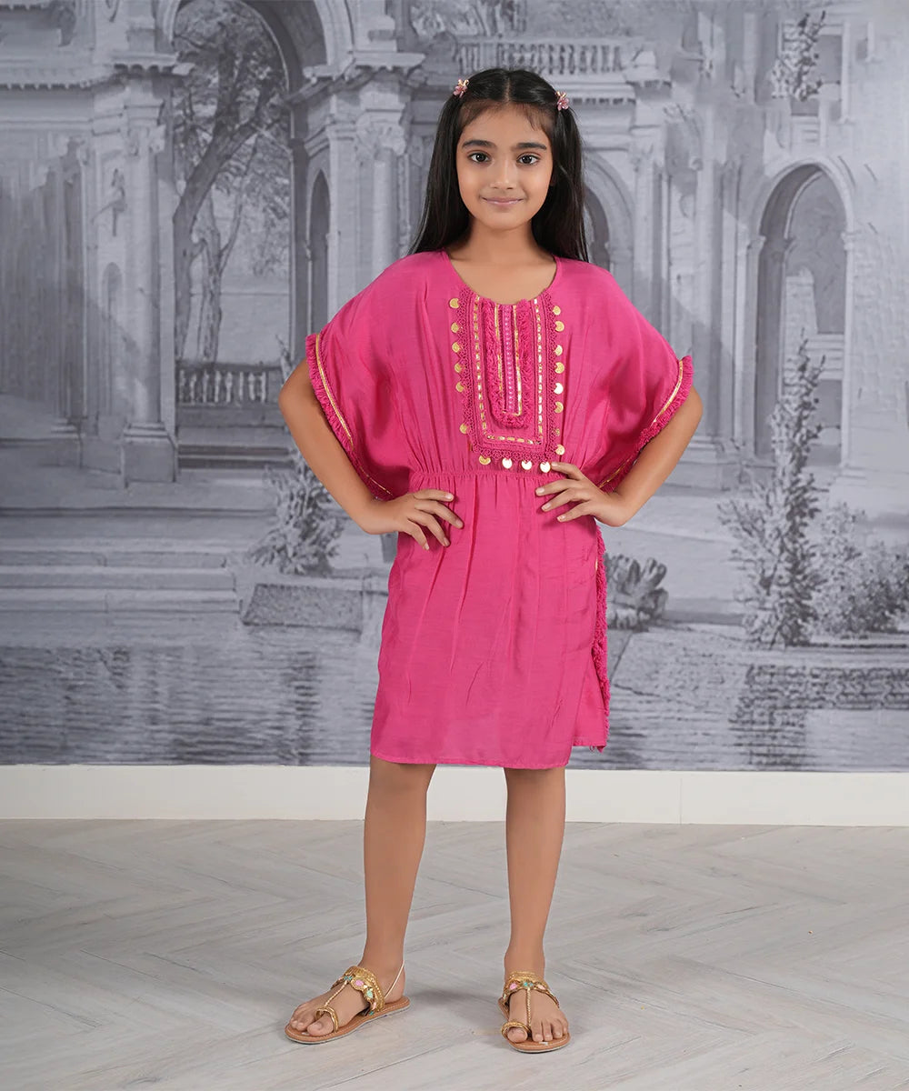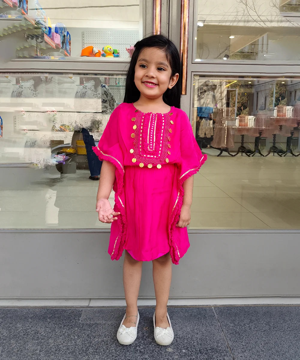 Vibrant rani pink kaftan dress for girls, designed in a trendy kaftan style—perfect for ages 2–14 years and ideal for birthdays, festive parties, and family gatherings
