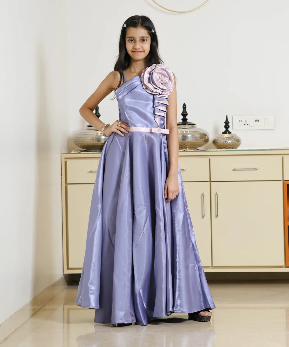 Statement floral detailing on the shoulder and a matching waist belt add a designer touch to this best party gown for girls