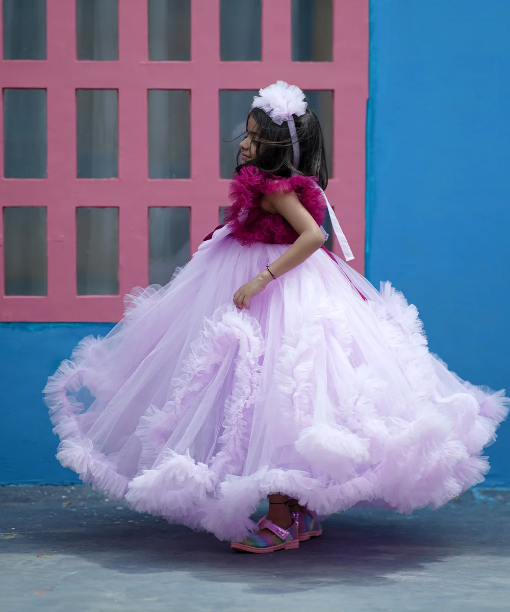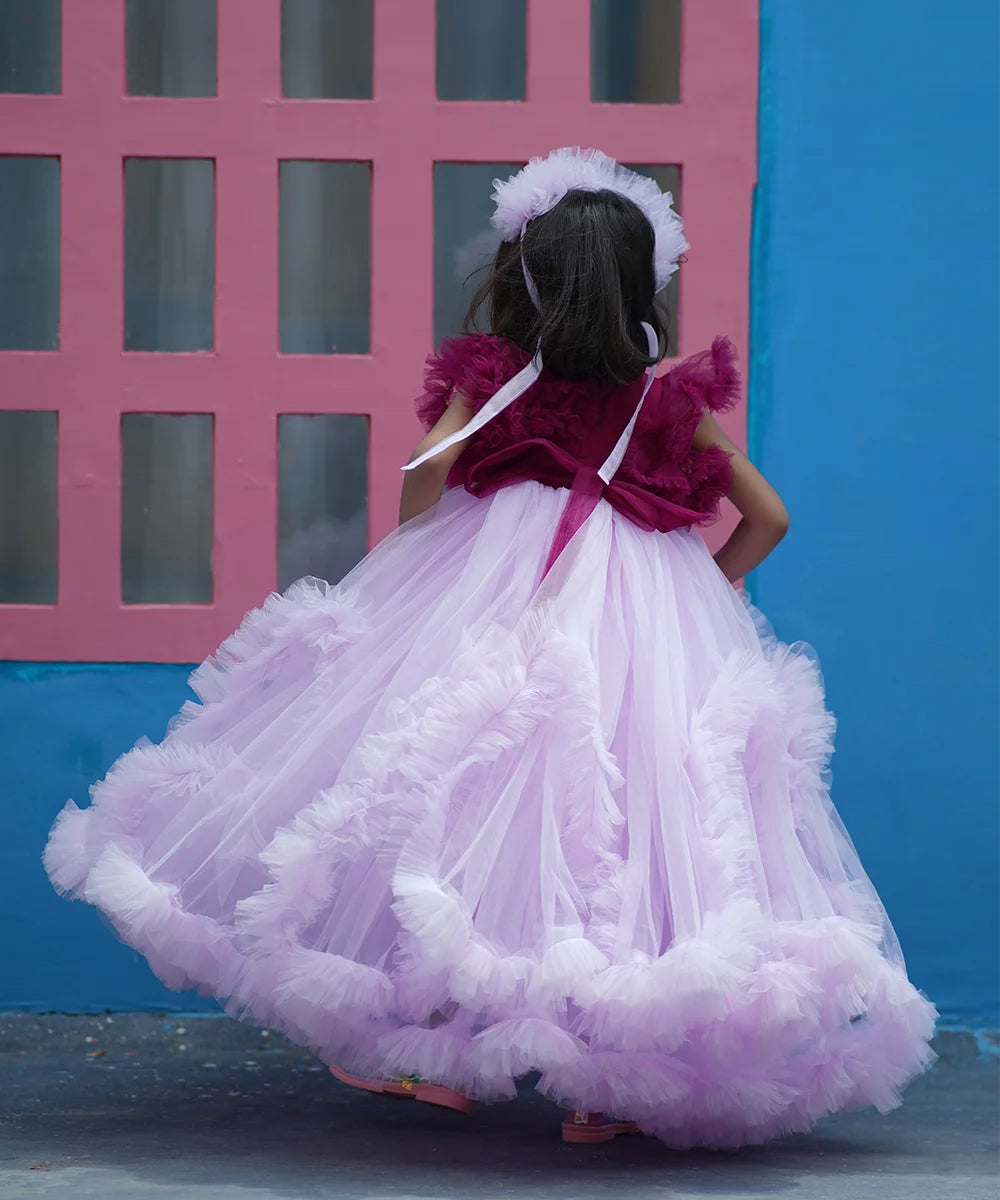 Gorgeous purple and wine fancy frill party wear gown for girls (ages 2–14 years), perfect as a birthday party gown, wedding gown for girls, or festive Children’s Gowns in Jaipur, designed to make every celebration magical