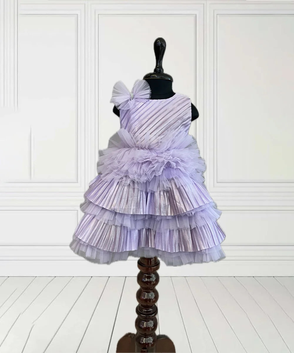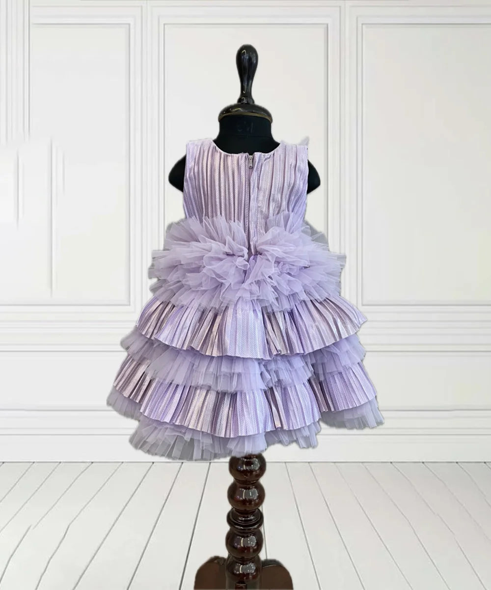It’s a purple coloured pretty frock with lots of frills and pleated detailing. It features a cute bow detailing on the dress and a back zip closure.