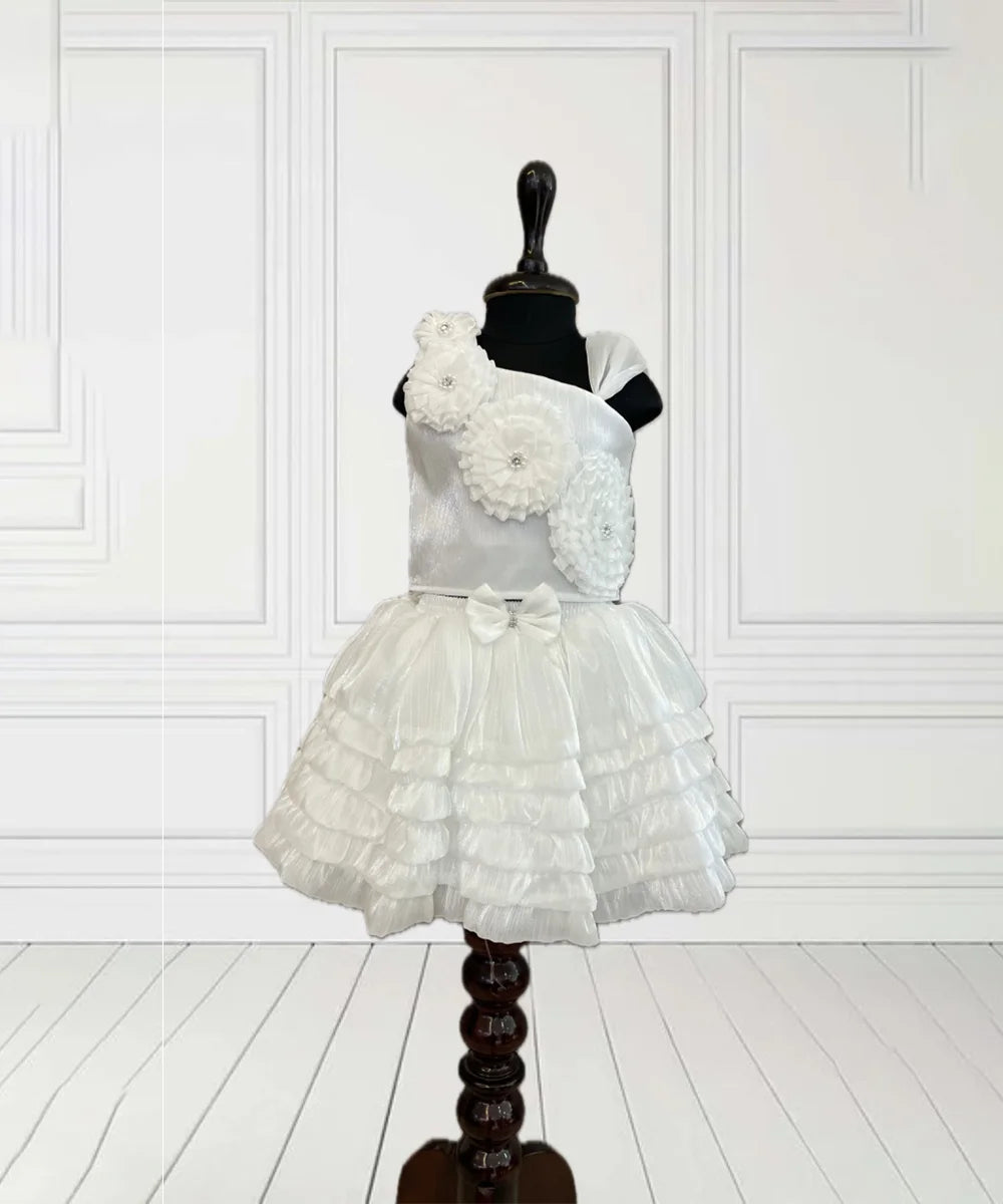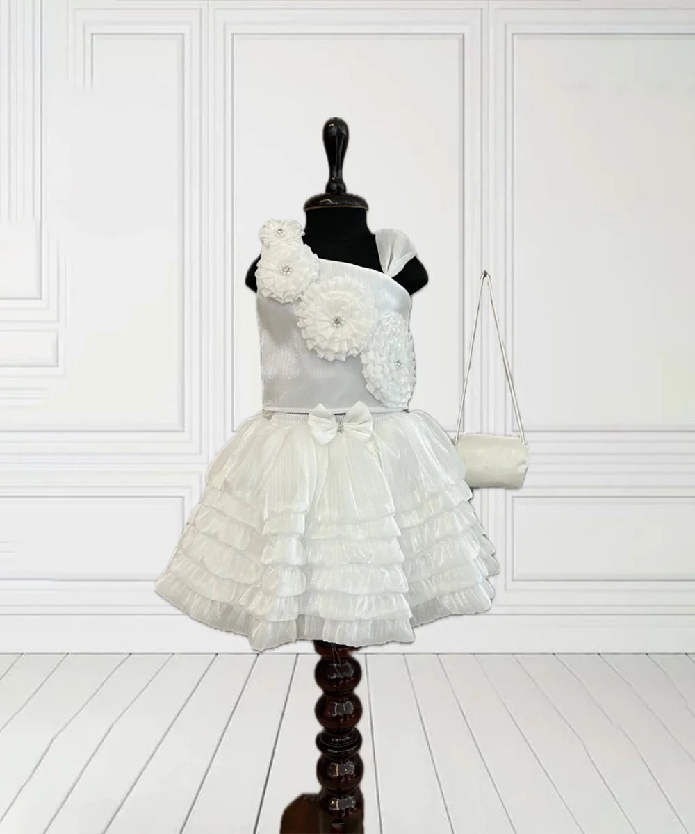 This White Coloured kids birthday wear dress consists of a crop top, a skirt and a matching handbag. It features floral detailing on the top and a cute bow on the waist.
