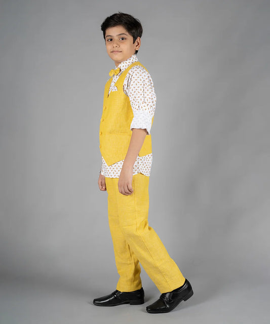 Mustard Colored Waist Coat Set with White Printed Shirt for Boys