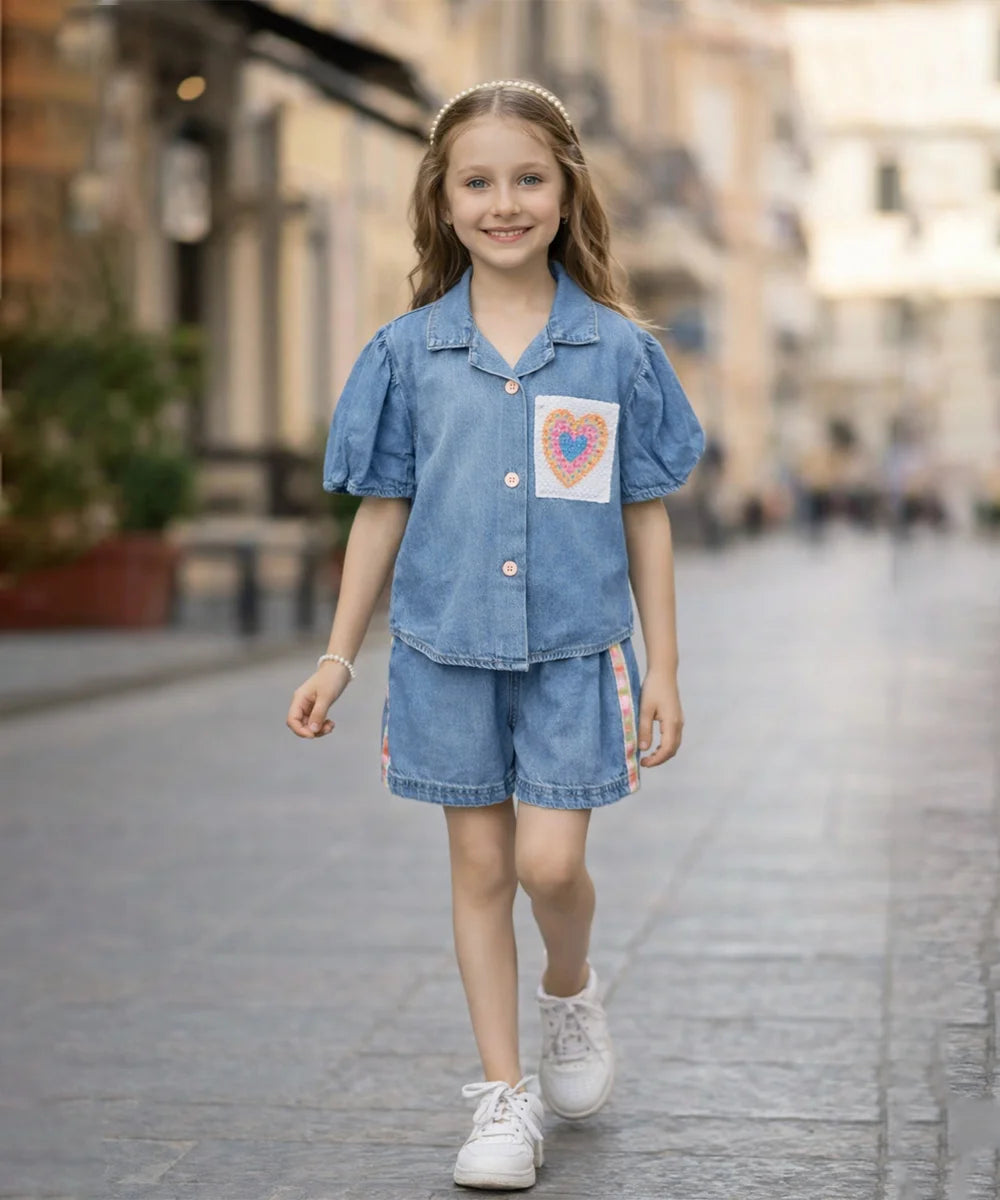 Blue Heart Pocket Denim Co-Ord Set for Girls