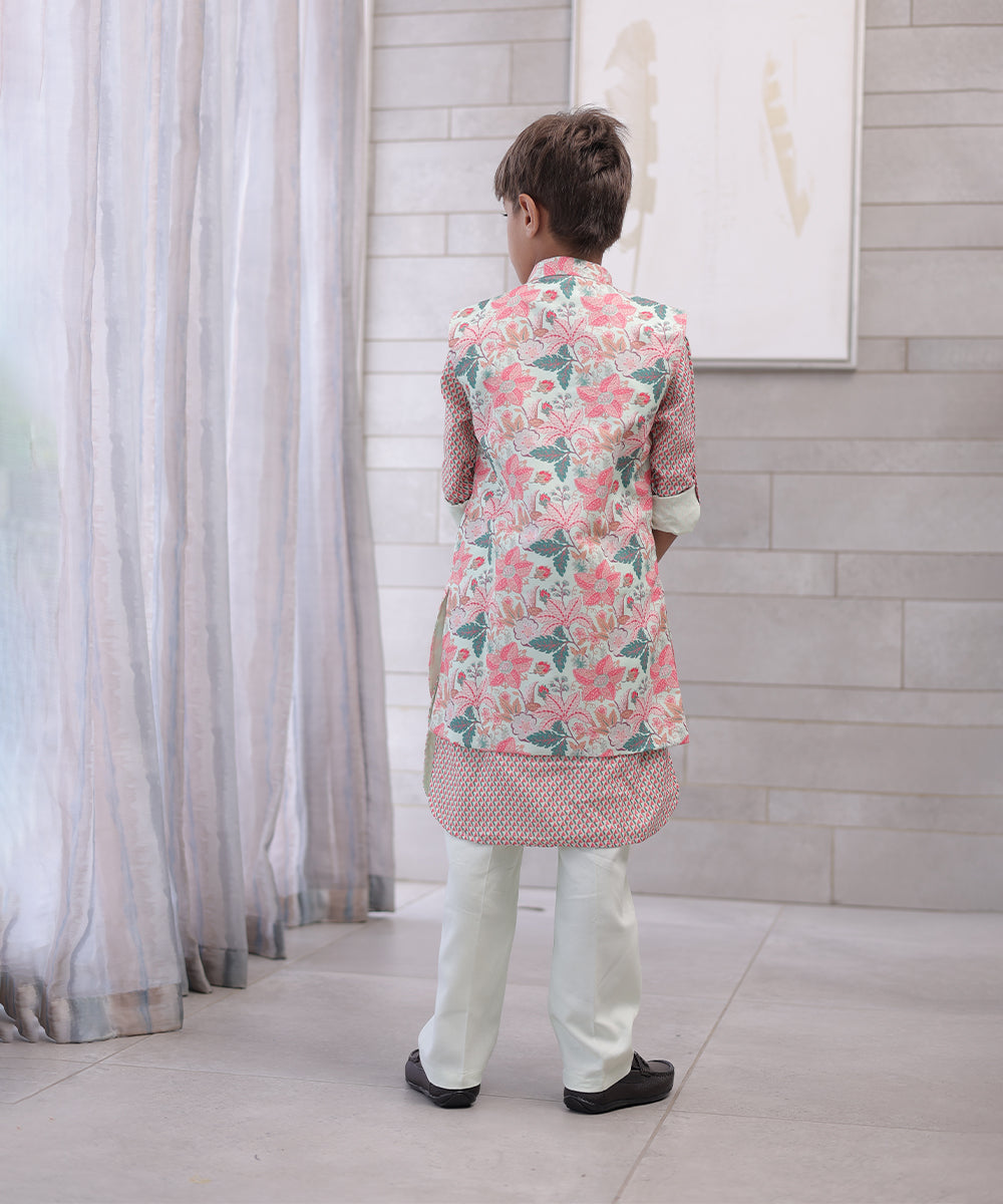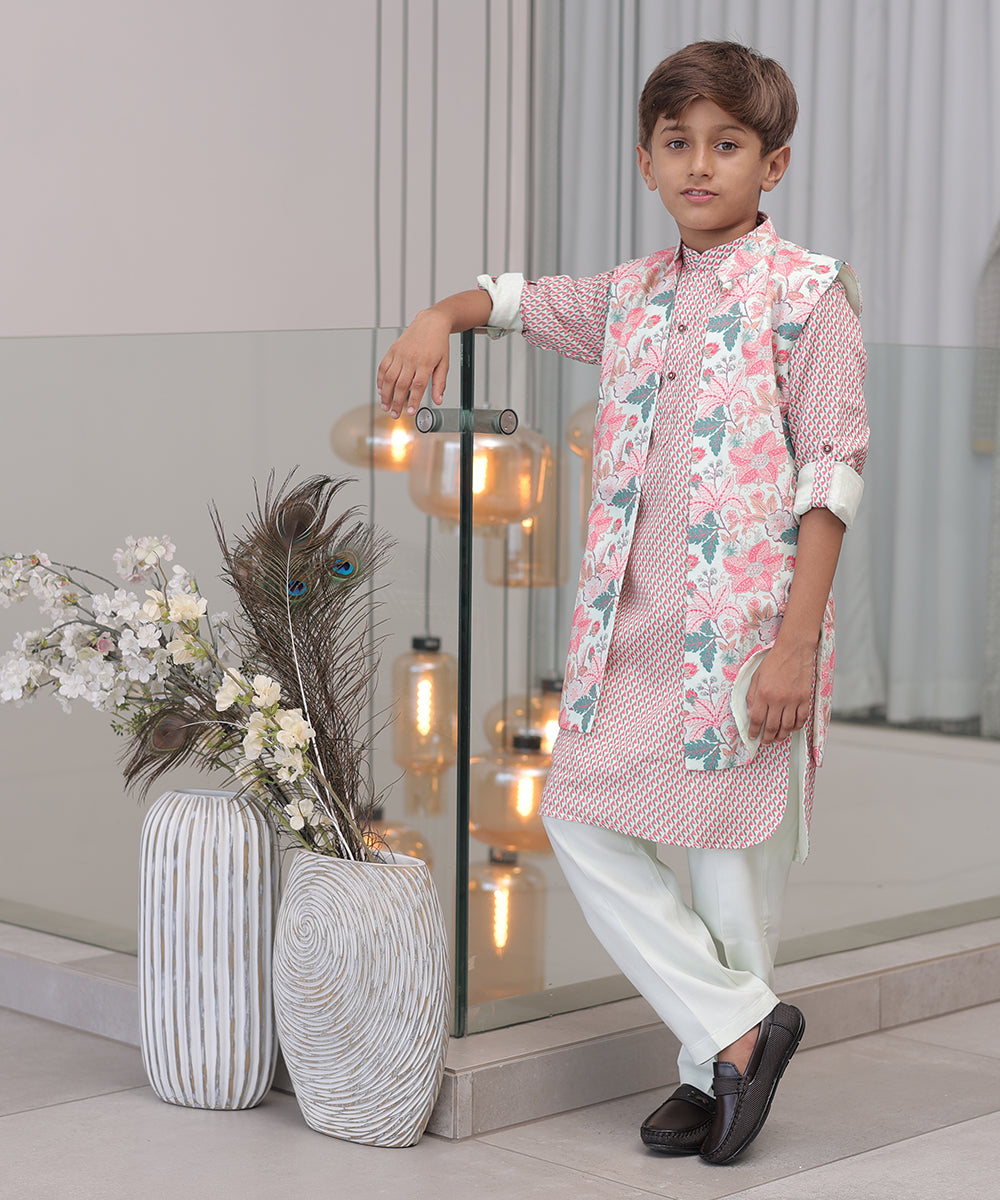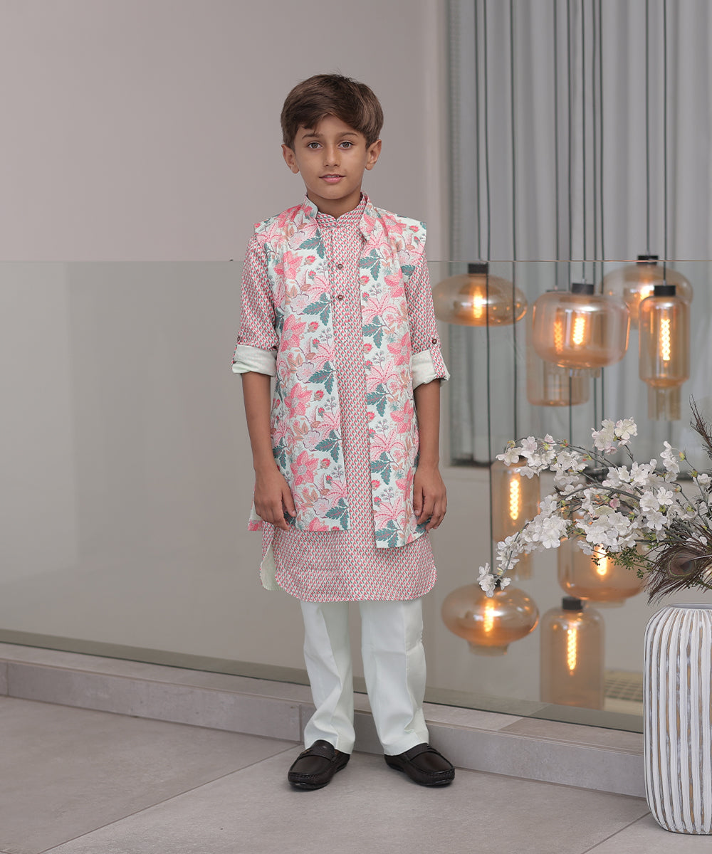 Stylish boys kurta pyjama set crafted for ages 2-3 years, featuring a full-length kurta and pyjama with a vibrant long printed waistcoat