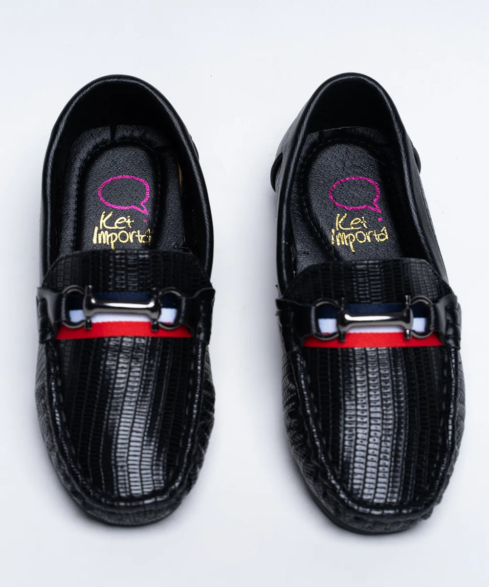 Kids' black textured loafers with metal buckle and red accent, Jaipur