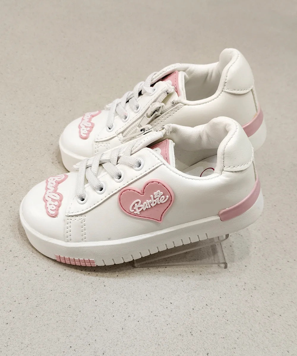 White sneakers with pink accents and 'Barbie' branding on a beige background