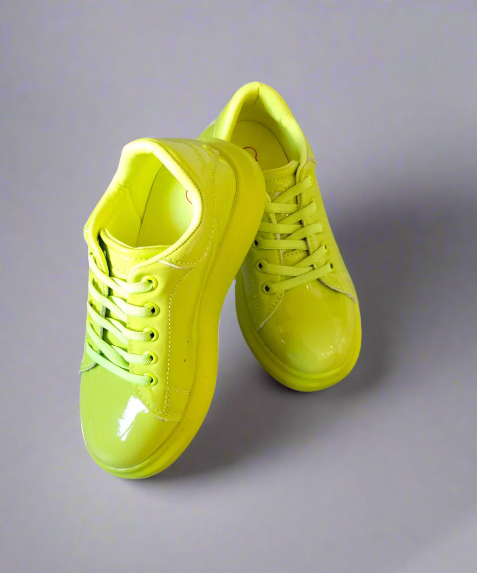 Neon lime girls' lace-up sneakers with glossy finish, Jaipur, ages 1–8 years