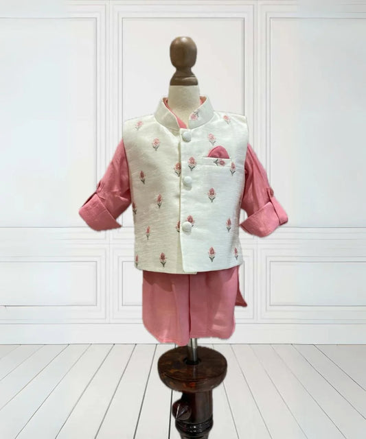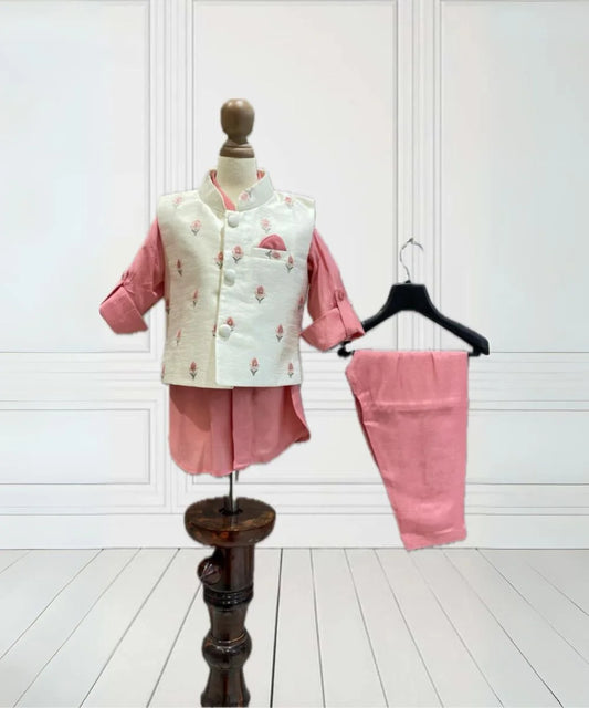 Beige Cotton Jute Fabric Waist Coat Set for 10 Year Old Boy