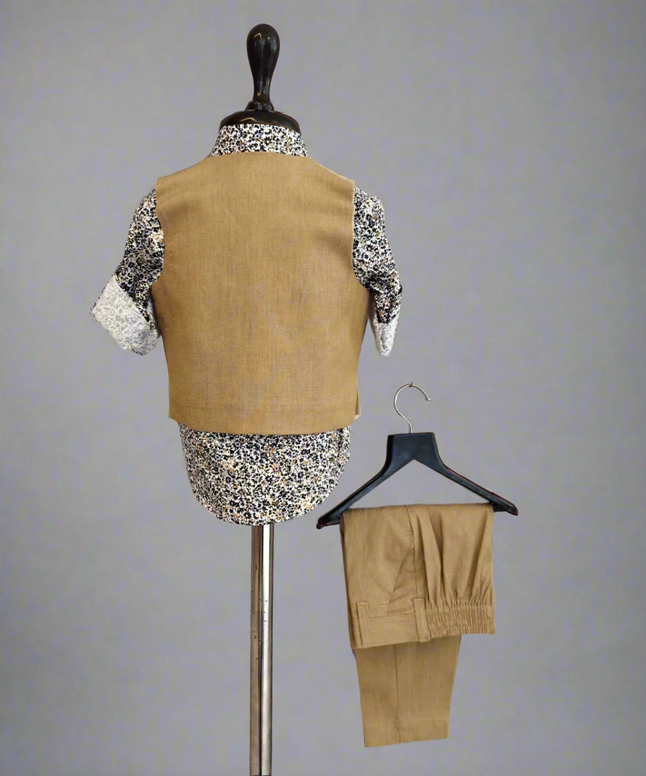 • Description: This wedding dress for a small boy consists of a self-textured waistcoat, matching pants and a self-printed shirt.