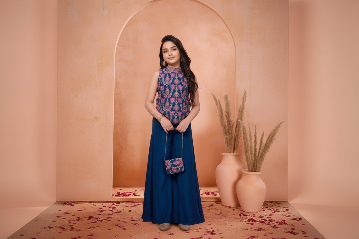Navy Blue Zari Embroidered Sharara Set for Girls Wedding Wear