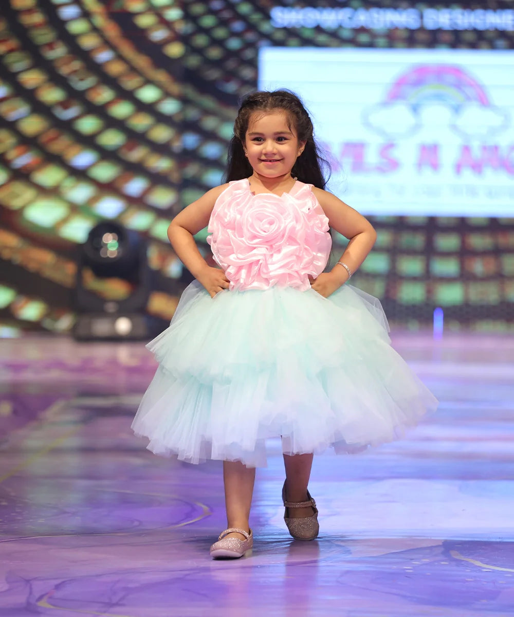 Stunning designer birthday frock for girls in pastel pink and white, featuring a dramatic floral bodice and a fluffy tutu skirt—perfect for ages 2–14 years