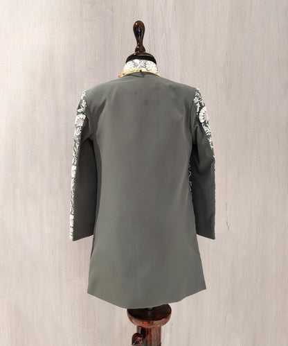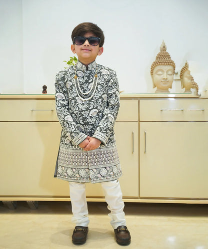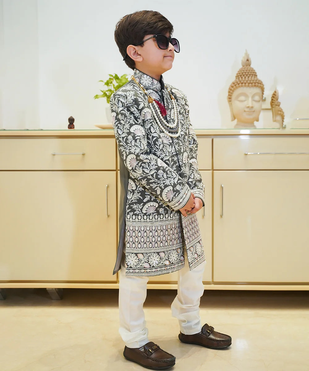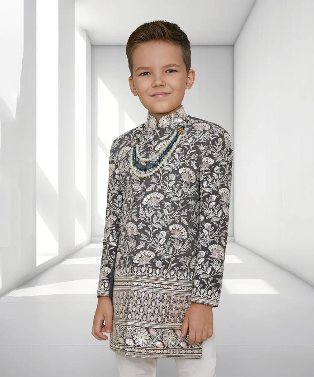Elegant grey self-embroidered sherwani set for boys (sizes 6–14 years), designed to add a royal touch to weddings, parties, and family celebrations in Jaipur.