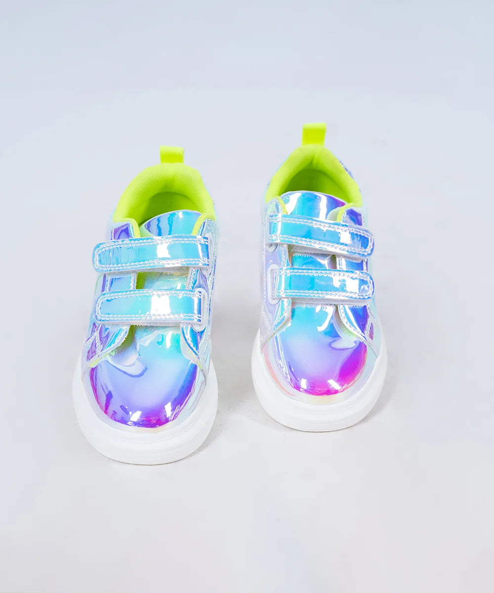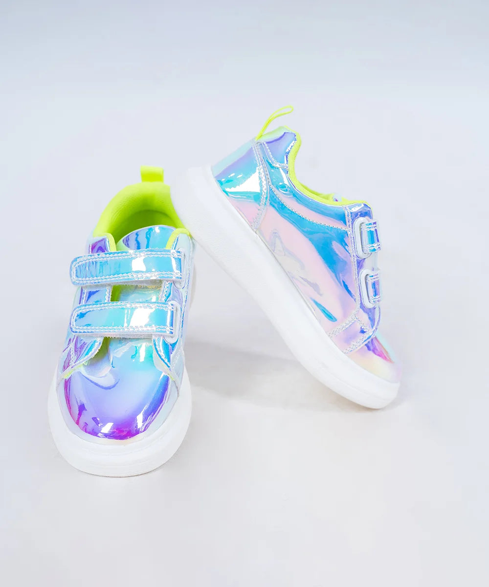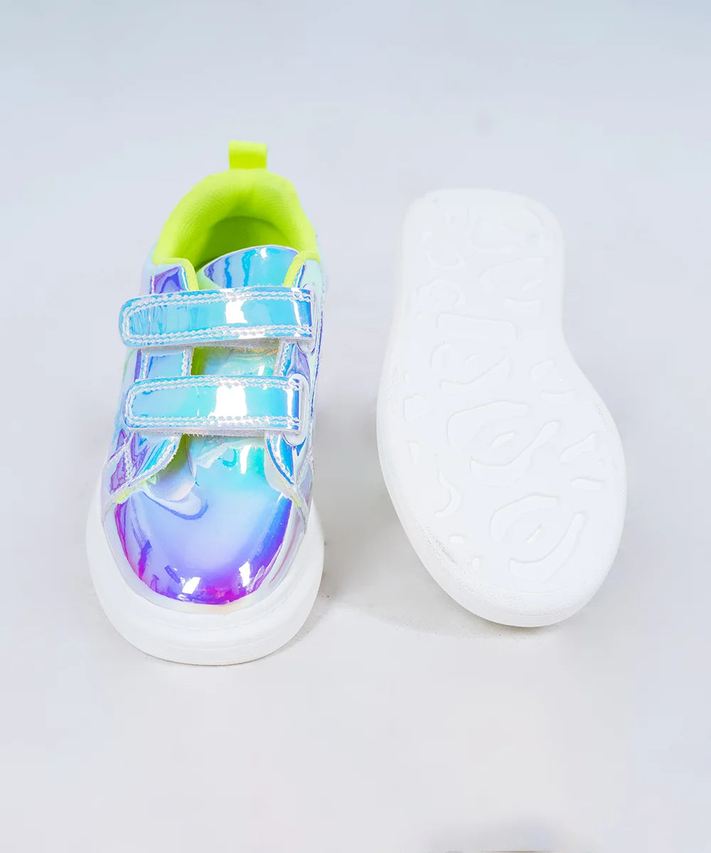 Let your child step out in style with these eye-catching holographic blue sneakers, designed for girls in Jaipur. Featuring a dazzling, iridescent finish that reflects a spectrum of colours, these shoes are sure to be a favourite for playdates, outings, or festive occasions. The double Velcro straps ensure a secure fit and easy on-and-off, while the cushioned sole and bright neon lining provide comfort and support for all-day wear. Perfect for girls aged 1 to 8 years, these sneakers combine futuristic flair with everyday practicality for Jaipur’s vibrant lifestyle.