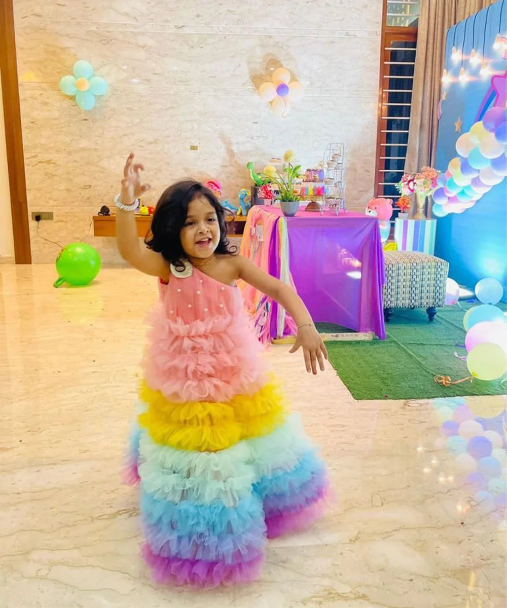 Crafted from premium soft net fabric in vibrant rainbow layers, this designer gown dress comes with a matching fabric belt to tie at the back, ensuring comfort and a perfect fit for long hours of fun