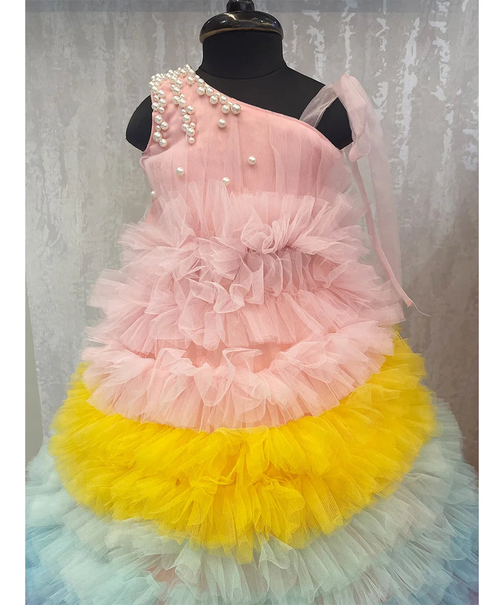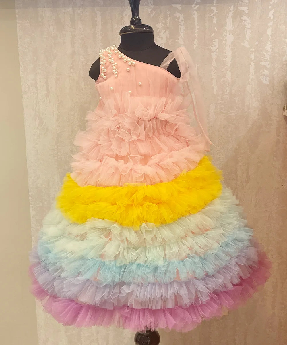 Stunning multi-colour ruffle party wear gown for girls (ages 2–14 years), perfect as a birthday party gown, wedding gown for girls, or festive Children’s Gowns in Jaipur, designed to make every celebration magical.