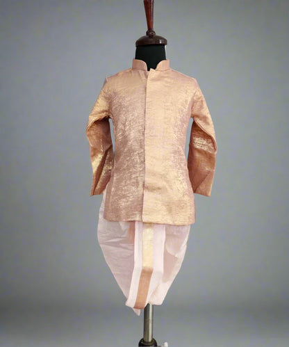 Adorable peach shimmer cotton dhoti kurta set for infant and toddler boys, crafted for ages 0-3 months to 2-3 years—available at the best kids clothing store in Jaipur and top-rated kidswear shop in Jaipur.