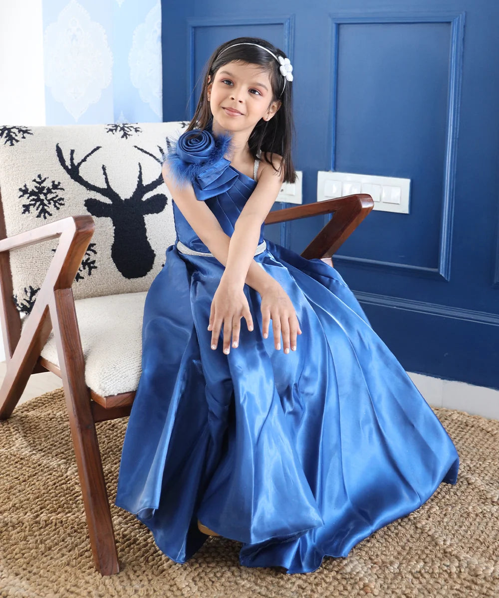 Features a chic one-shoulder neck with a dramatic big flower broach on the shoulder, classic pleated detailing on the yoke, and a glittering belt-style accent at the waist for a princess gown silhouette